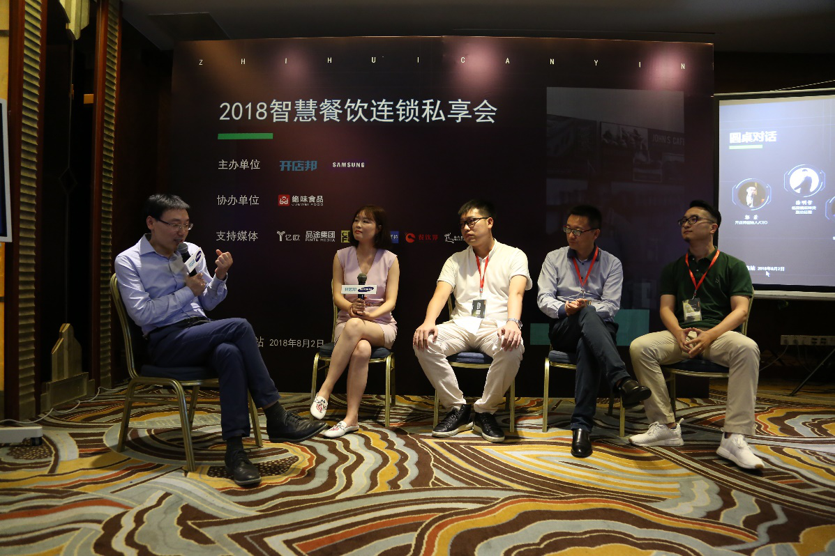 活動最后的圓桌論壇環(huán)節(jié),在開店邦創(chuàng)始人兼CEO郭景的主持下,蝦吃蝦涮品牌創(chuàng)始人牛艷、楊國福麻辣燙副總經(jīng)理徐明哲、望湘園副總裁趙建光、蝦吃蝦涮品牌創(chuàng)始人牛艷、慕瑪披薩合伙人顧葉挺共同就“連鎖餐飲基于技術(shù)升級的自我賦能”展開了深入的探討。