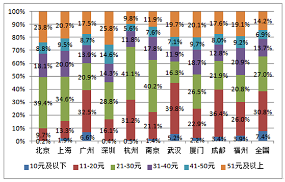 全國及重點(diǎn)城市餐飲外賣訂單客單價分布占比