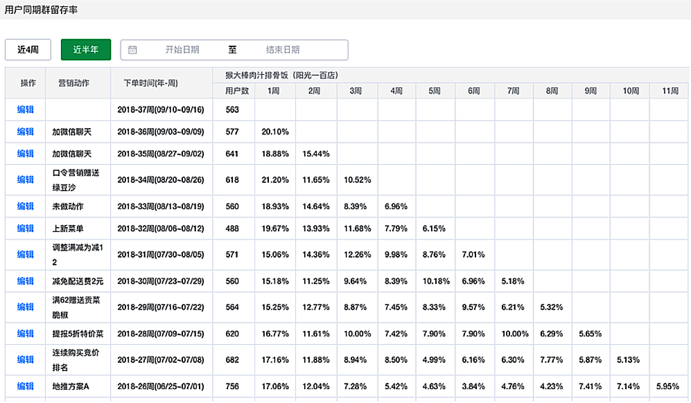 但是光看留存率不足以來評估我們的經(jīng)營管理動作是健康,我們還需要引入另外一個叫“同期群”的概念。同期群是指在相同時間內(nèi)經(jīng)歷同種事件的人群,例如我們將時間劃分為每周,每次的調(diào)整以周為單位,第一周做競價、第二周做地推、第三周主要做微信溝通聊天、第四周我需要換菜單,然后我們來關(guān)注做了這幾個動作的同期群留存率變化如何。