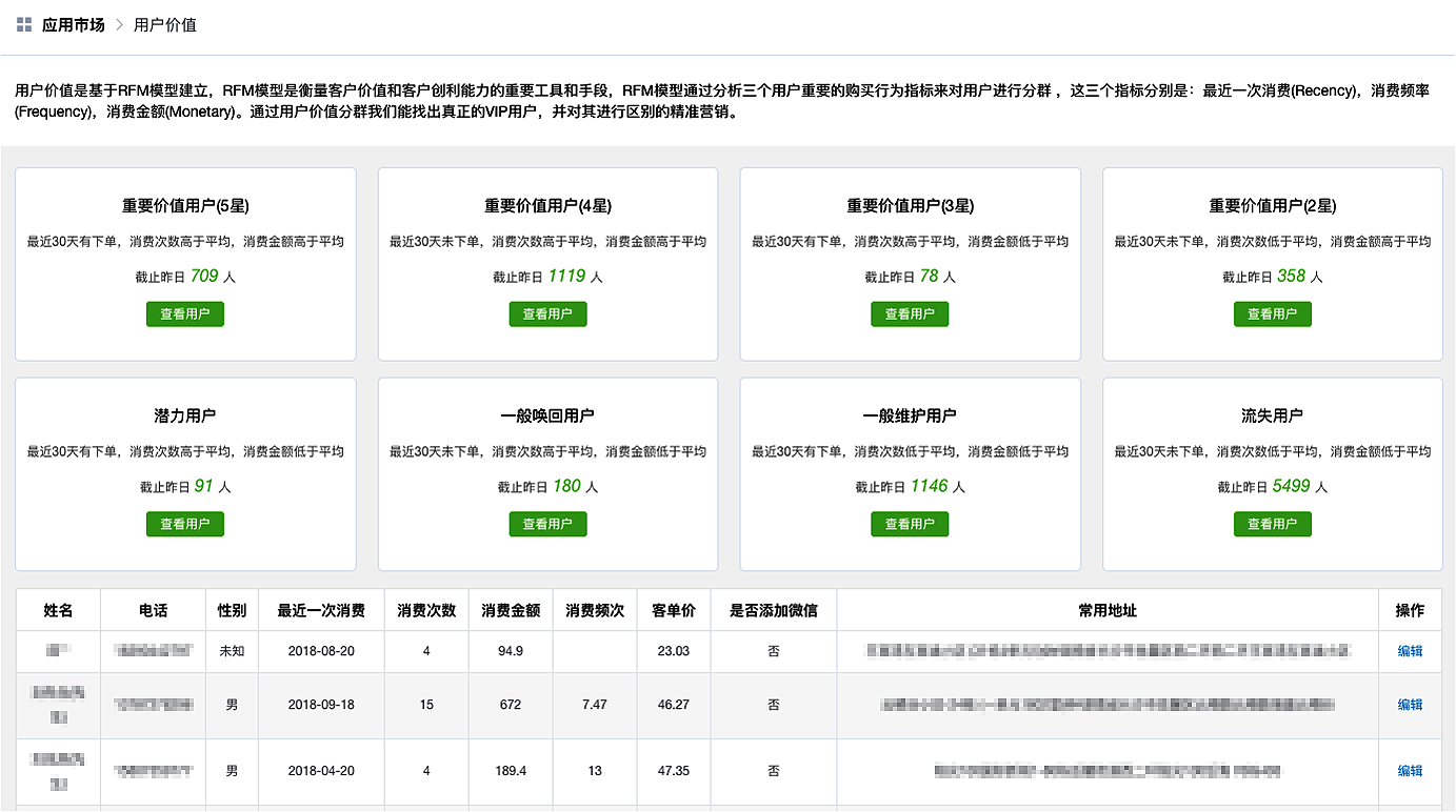 用戶價值是基于RFM模型建立,RFM模型是衡量客戶價值和客戶創(chuàng)利能力的重要工具和手段,RFM模型通過分析三個用戶重要的購買行為指標(biāo)來對用戶進(jìn)行分群 ,這三個指標(biāo)分別是:最近一次消費(fèi)(Recency),消費(fèi)頻率(Frequency),消費(fèi)金額(Monetary)。通過用戶價值分群我們能找出真正的VIP用戶,并對其進(jìn)行區(qū)別的精準(zhǔn)營銷。依據(jù)經(jīng)典的二八原則,我們80%的銷售由20%的用戶貢獻(xiàn),那么我們?nèi)绾慰焖俣珳?zhǔn)的找到那20%用戶并與其發(fā)生深度關(guān)聯(lián),是極度考驗(yàn)我們對數(shù)據(jù)的綜合分析處理能力的。同時我們也可以做一個實(shí)驗(yàn),去美團(tuán)后臺使用精準(zhǔn)營銷,給高消費(fèi)熟客與需一般挽留的流失顧客發(fā)同樣的優(yōu)惠券,高消費(fèi)熟客的使用率會遠(yuǎn)遠(yuǎn)高于需一般挽留的流失顧客。