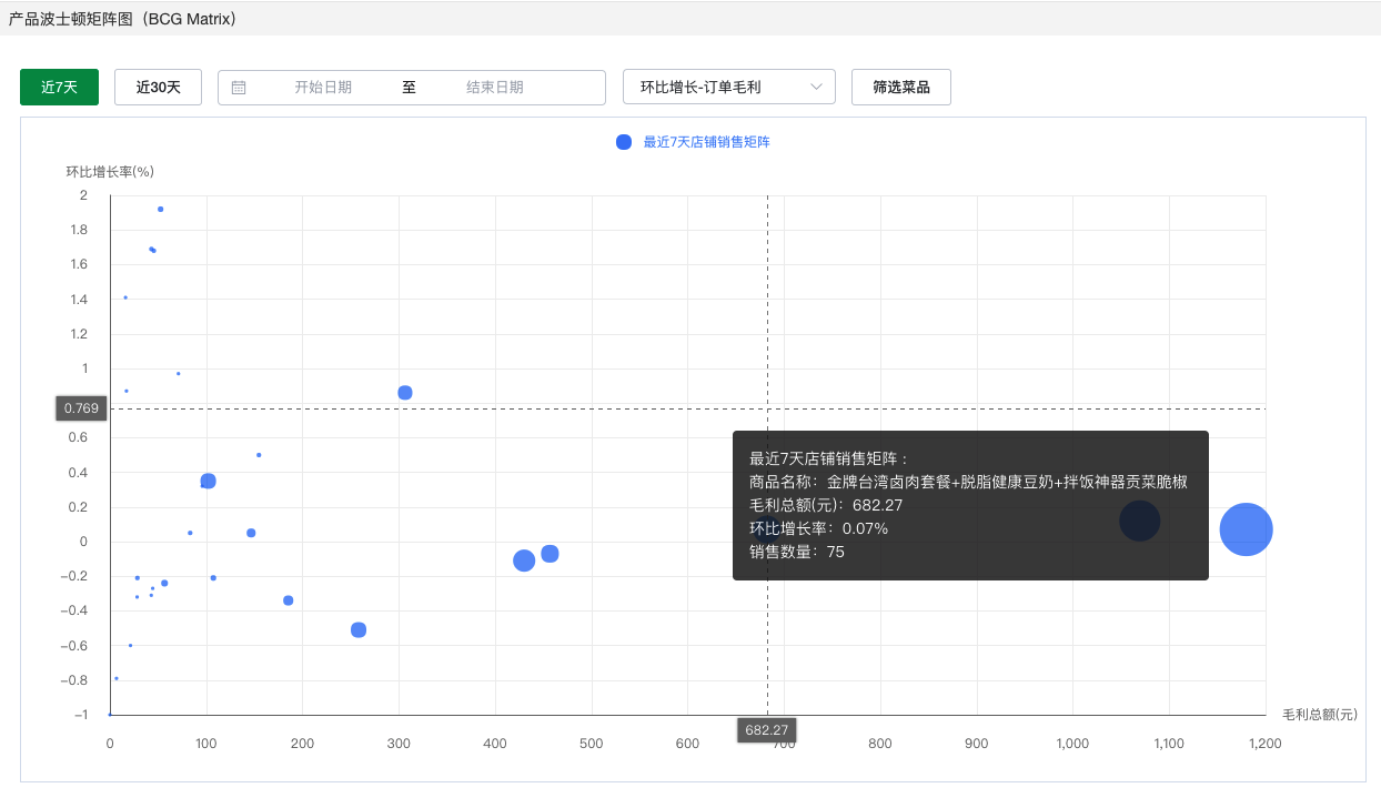 如圖我們選取了兩個維度,環(huán)比增長率與訂單毛利。右下角代表現(xiàn)金牛產(chǎn)品,他的銷售波動穩(wěn)定能夠持續(xù)貢獻(xiàn)收入,我們對這類產(chǎn)品的態(tài)度是要持續(xù)保持生產(chǎn)的穩(wěn)定,同時規(guī)?;纳a(chǎn)采購以進(jìn)一步降低成本。右上角代表明星產(chǎn)品,這類產(chǎn)品的環(huán)比增長迅速,利潤貢獻(xiàn)可觀,對這類產(chǎn)品的態(tài)度是要持續(xù)觀察其穩(wěn)定程度,使其盡快穩(wěn)定過渡到現(xiàn)金牛產(chǎn)品,如果這個象限中像圖中所示沒有產(chǎn)品,那么表示企業(yè)的產(chǎn)品研發(fā)能力出現(xiàn)問題,并沒有產(chǎn)生新的可以成長的產(chǎn)品,需要反思。左上角為問題產(chǎn)品,他的增長速度快,但是毛利較低,對這類產(chǎn)品的態(tài)度是要盡快的調(diào)整利潤與營銷策略。左下角為瘦狗產(chǎn)品,他的增長速度低,毛利也低,對這類產(chǎn)品的態(tài)度是要盡快的淘汰。
