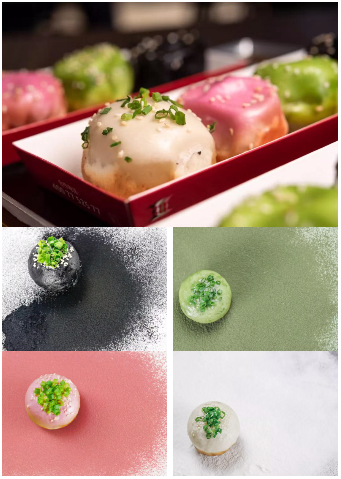 最終確定了用江蘇面粉制作原味鮮肉味生煎面皮,東海墨魚汁制作椒麻魚肉味生煎面皮,火龍果汁制作蝦仁鮮肉味生煎面皮,菠菜汁制作薺菜鮮肉味生煎面皮。當(dāng)然這些是遠(yuǎn)遠(yuǎn)不夠的,我們?nèi)栽诓粩嚅_發(fā)更多新顏色、新口味。