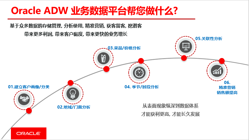因此,在餐飲業(yè)智慧轉(zhuǎn)型的過程中,一個(gè)性能強(qiáng)大的數(shù)據(jù)平臺(tái)無疑是餐飲企業(yè)實(shí)現(xiàn)變革和創(chuàng)新的必要條件。深耕企業(yè)級(jí)數(shù)據(jù)管理多年的甲骨文公司,利用Oracle ADW業(yè)務(wù)數(shù)據(jù)平臺(tái)可以提供基于眾多數(shù)據(jù)的存儲(chǔ)管理、分析使用、精準(zhǔn)營銷、獲客留客、挖掘潛客等功能,為餐飲企業(yè)帶來更多利潤, 提升客戶黏度, 實(shí)現(xiàn)更快的業(yè)務(wù)增長。