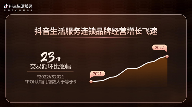 作為餐飲經(jīng)營新陣地,抖音生活服務(wù)不斷為廣大餐飲商家?guī)砩庠隽俊H缃?,抖音生活服?wù)業(yè)務(wù)覆蓋全國370+個城市,合作門店超200萬家。其中,抖音生活服務(wù)POI認領(lǐng)門店數(shù)大于等于3的連鎖品牌,2022對比2021年整體交易額環(huán)比增長了23倍。這說明,越來越多的連鎖品牌在抖音生活服務(wù)的投入產(chǎn)出不斷擴大,打開了長效經(jīng)營新路徑。