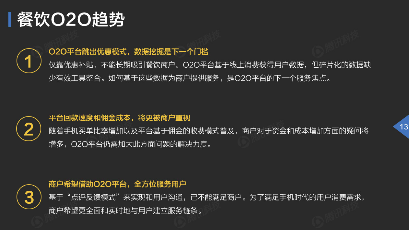 報(bào)告還稱,以優(yōu)惠和補(bǔ)貼建立的合作模式引起商家的擔(dān)憂,即以低價(jià)吸引的曝光是否能長期維持,基于點(diǎn)評反饋模式的用戶溝通,也已不能滿足商戶。商戶期待更具可持續(xù)價(jià)值的合作方式,目前看來,如何基于用戶的消費(fèi)數(shù)據(jù)為商戶提供服務(wù),幫助商家更全面實(shí)時(shí)地與用戶建立服務(wù)鏈條,將是O2O平臺(tái)的下一個(gè)焦點(diǎn)