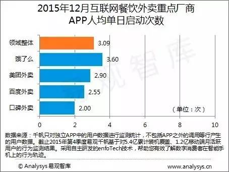 數(shù)據(jù)顯示,2015年12月餓了么的人均單日訪問時長為7.83分鐘,高于外賣領(lǐng)域整體APP人均單日訪問時長的7.09分鐘。在人均單日啟動次數(shù)方面,餓了么以3.6次同樣位居第一。