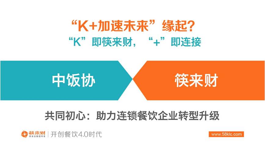 李宏文稱:“K+加速未來”計劃是應時應需而生。所謂“K”即筷來財,“+”即連接。“K+加速未來”計劃通過中飯協(xié)和筷來財?shù)暮献?,連接中國餐飲市場上150萬家連鎖餐飲企業(yè),連接200萬+連鎖餐廳,連接600萬家食材供應商,連接1000萬+的個人投資者,充分發(fā)揮中飯協(xié)全國性行業(yè)組織和筷來財餐飲業(yè)公共服務基礎設施的作用,助推餐飲企業(yè)完成升級轉型,促進餐飲產(chǎn)業(yè)的可持續(xù)發(fā)展。