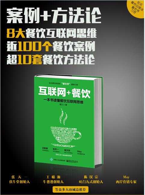 據(jù)了解,《“互聯(lián)網(wǎng)+餐飲”:一本書讀懂餐飲互聯(lián)網(wǎng)思維》一書由“餐飲界”新媒體創(chuàng)始人鶴九所著。該書從實戰(zhàn)性出發(fā),深入淺出地為餐飲人揭開互聯(lián)網(wǎng)神秘莫測的面紗,不僅從戰(zhàn)略層面,通過案例剖析“跨界思維、產(chǎn)品經(jīng)理思維、大數(shù)據(jù)思維”3大互聯(lián)網(wǎng)思維如何應用;還從戰(zhàn)術層面總結(jié)出了“社群思維、參與感思維、炒作思維、自媒體思維、平臺思維”5大互聯(lián)網(wǎng)思維模式。
