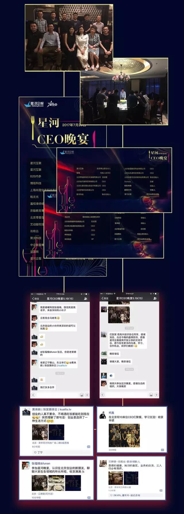 由此我們策劃“認識更多CEO、互助更多CEO”的星河CEO晚宴,讓您在輕松的晚宴中結識跨界牛人,跨領域社交、學習、人脈拓展,甚至融資的事情都可能在這一頓飯的時間里解決了。