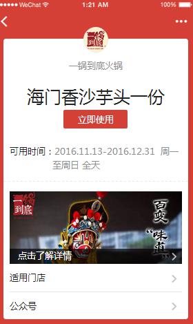 在廣告創(chuàng)意上,一鍋到底以文案“煮一鍋紅艷,品百味人生”配合圖片四川經(jīng)典的變臉形象烹制火鍋,重慶火鍋紅油翻滾的場(chǎng)景躍然眼前,讓吃貨們浮想聯(lián)翩。用戶(hù)點(diǎn)擊“領(lǐng)取優(yōu)惠”,可直接跳轉(zhuǎn)到卡券領(lǐng)取頁(yè)面,免費(fèi)獲得一份海門(mén)香沙芋頭的福利,憑核銷(xiāo)碼到店消費(fèi)??ㄈ?yè)面嵌入規(guī)則介紹和適用門(mén)店,促進(jìn)用戶(hù)到店。