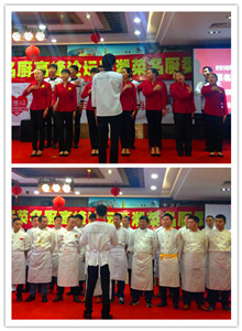 會(huì)上還邀請(qǐng)了土灶坊一線員工上臺(tái)展現(xiàn)特色企業(yè)文化,一聲聲激昂士氣的口號(hào)和整齊劃一的晨舞讓場(chǎng)下嘉賓拍手稱贊。而后全體廚師上臺(tái)進(jìn)行亮德宣誓更是震撼了全場(chǎng)來賓,大廚們?cè)谂腼兯囆g(shù)家王浩宇先生的帶領(lǐng)下,統(tǒng)一著裝,上臺(tái)共同宣誓,堅(jiān)持“亮德”,以良心廚藝打造“雙心餐廳”。背后簽滿廚師名的亮德橫幅更加彰顯了眼前這數(shù)十位名廚的亮德決心,嘉賓們也用最熱烈的掌聲對(duì)亮德行動(dòng)表示支持。